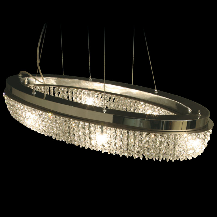 Descrizione: Un lampadario a sospensione in forma di ellisse è realizzato in metallo cromato e un gran numero di pendenti di cristallo. È predisposto per 6 lampadine alogene da 40W con attacco G9. L’altezza del lampadario è regolabile, max 90cm.
