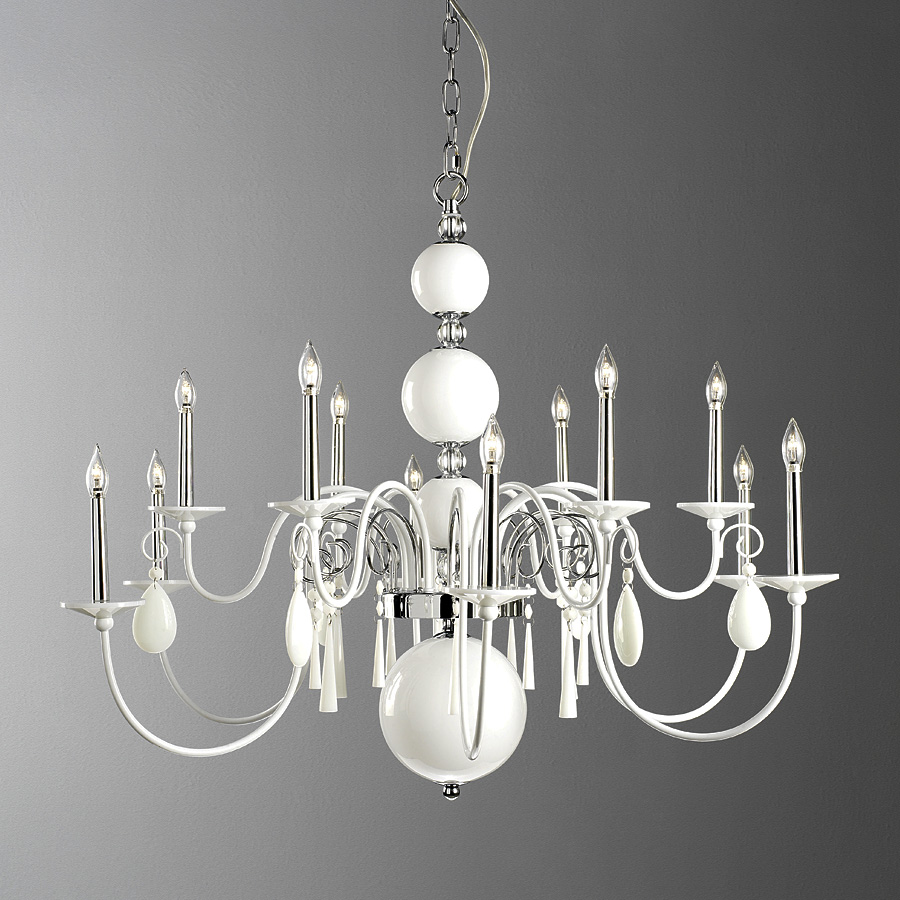 Descrizione: Lampadario a sospensione è predisposto per 12 lampadine alogene da 20W con attacco G4. Il telaio è realizzato in metallo e decorato con delle sfere di vetro e pendenti di colore bianco. La lunghezza della catena è regolabile. Il design originale del modello si integrerà perfettamente negli interni sia classici che moderni. Le lampadine nello stile di candele aggiungono alla stanza un particolare aspetto aristocratico.
