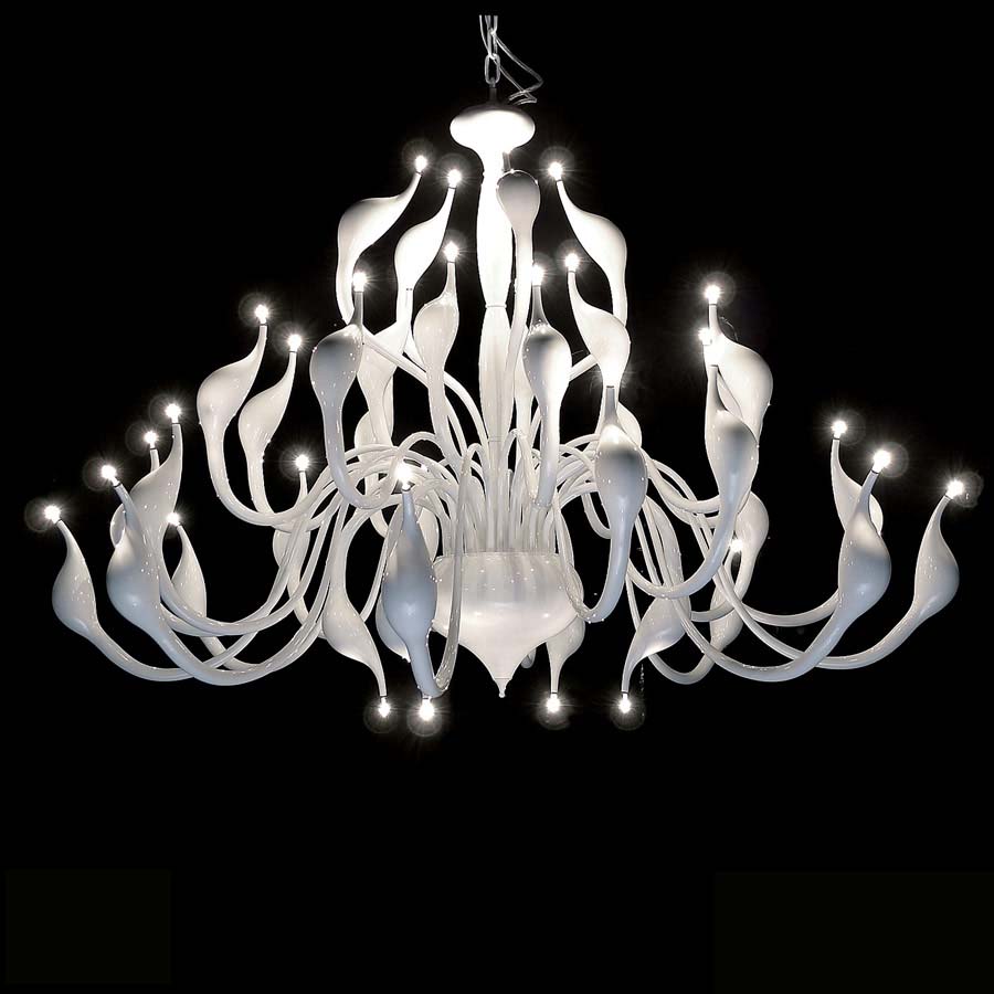 Descrizione: L’elegante design del lampadario Cigno ricorda raffinati cigni bianchi e affascina con la sua bellezza. Il lampadario è realizzato interamente in metallo di qualità coperto con smalto bianco lucido. È predisposto per 36 lampadine alogene da 20W con attacco G4.