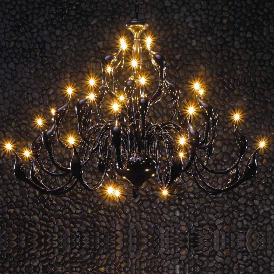 Descrizione: L’elegante design del lampadario Cigno ricorda raffinati cigni neri e affascina con la sua bellezza. Il lampadario è realizzato interamente in metallo di qualità coperto con smalto nero lucido. È predisposto per 36 lampadine alogene da 20W con attacco G4.