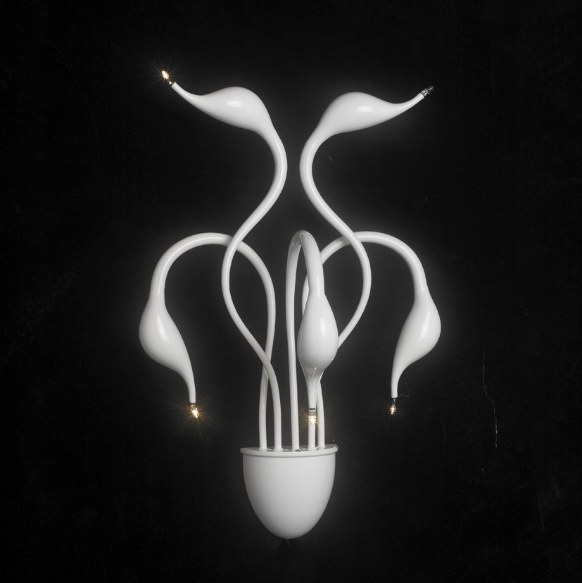 Descrizione: Lampada da parete Cigno così come i lampadari di questa serie ricorda cigni bianchi assottigliati. È realizzata interamente in metallo di qualità coperto con smalto bianco lucido. È predisposta per 5 lampadine alogene da 20W con attacco G4.