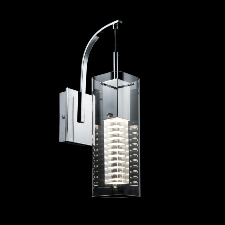 Descrizione: L’applique della serie Bar nello stile high-tech è predisposta per 1 lampadina alogena da 35W con attacco GU5,3. La parte principale della lampada ha una copertura cromata lucida. La plafoniera è composta di due elementi di vetro: un cilindro esterno e prismi con incisione a laser. Grazie a ciò succede una rifrazione spettacolare del raggio luminoso che crea nella stanza un’atmosfera speciale.