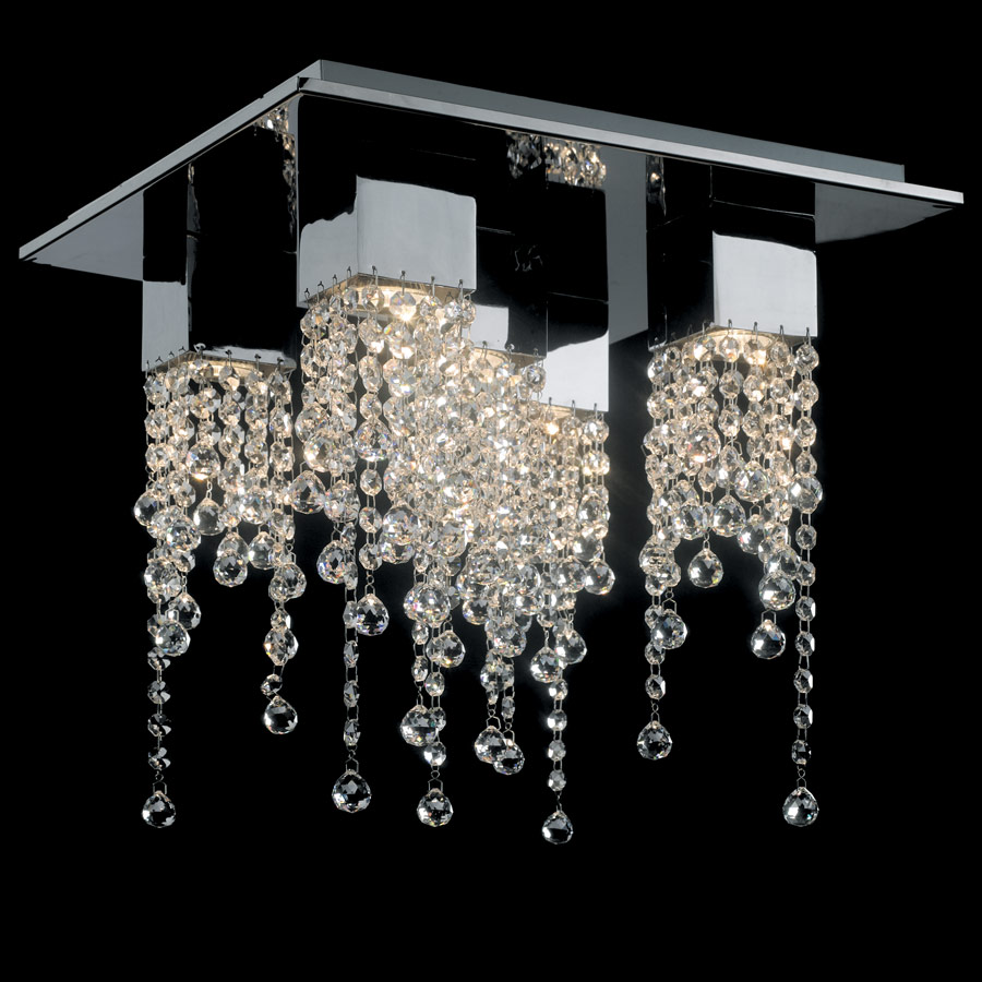 Descrizione: Lampadario da soffitto ha 5 plafoniere realizzate in metallo cromato. Un eleganza speciale viene conferita a questa fonte luminosa dai filamenti di cristallo che completano ogni plafoniera. Il lampadario è predisposto per 5 lampadine alogene da 35 — 50 W con attacco GU10.