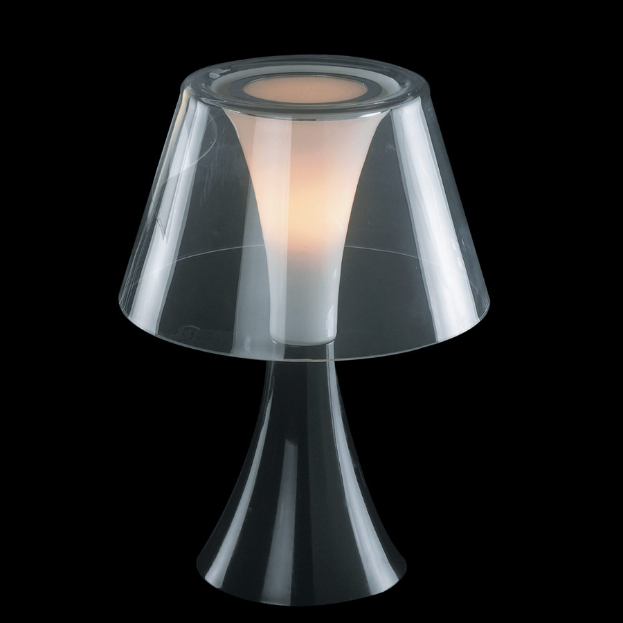 Descrizione: Elegante lampada da tavolo è predisposta per una lampadina a risparmio energetico da 13W con attacco Е14. La base è realizzata in vetro bianco e plastica nera. La plafoniera è di vetro.
